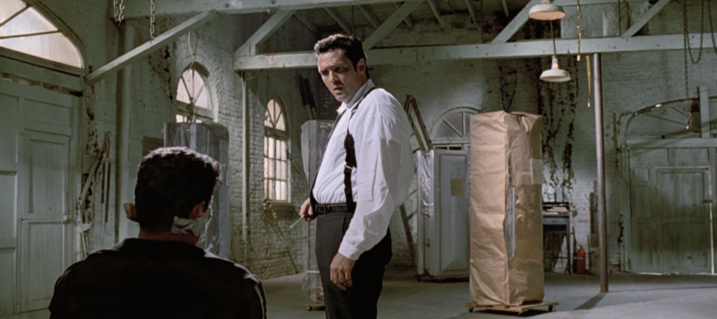پس از بیان مواردی که مرتبط به فیلمنامه بود، به موردی منتقل شویم که مربوط به کارگردانی است. در قسمتی از فیلم، وقتی آقای صورتی -با بازی استیو بوشمی- مشغول صحبت است، دوربین آقای سفید را نشان میدهد که سکوت کرده. دوربین آرامآرام به او نزدیک میشود، به نحوی که حرف آقای صورتی کماهمیت تلقی میشود و خالق، این انتظار را در مخاطب ایجاد میکند که گویی قرار است آقای سفید واکنشی (اعم از حرف یا عمل) از خود بروز دهد که تعیینکننده و مهم است. در حالی که اینگونه نیست. تمرکز دوربین با زوم روی آقای سفید ظاهراً باید نکتهای میداشت، اما این انتظار مخاطب پاسخ نیافته، نکتۀ تعیینکنندهای بیان نمیشود. البته این را ذکر کنیم که کمی بعد آقای سفید میگوید باید فرد زخمی را به بیمارستان برد. آقای صورتی هم موافقت میکند. اما آقای سفید در ادامه میگوید که فرد زخمی اندکی از هویت او میداند و اینجاست که حرفش واکنشی شدید را در طرف مقابل برمیانگیزد. اما وجود این صحنه (زوم دوربین روی آقای سفید) زمانی حس را درگیر میکرد که آقای صورتی از قبل در خصوص اطلاع آقای نارنجی از هویت آقای سفید بداند. چنین صحنهای در نسبت با آن زوم دوربین میتوانست مهم تلقی شود (هر چند نه زیاد، اما این قابلیت را به طور حداقلی داشت). در نتیجۀ تمام این گزارهها، دوربین کارگردان در آن صحنه متناسب با موقعیت مورد نظر نیست.