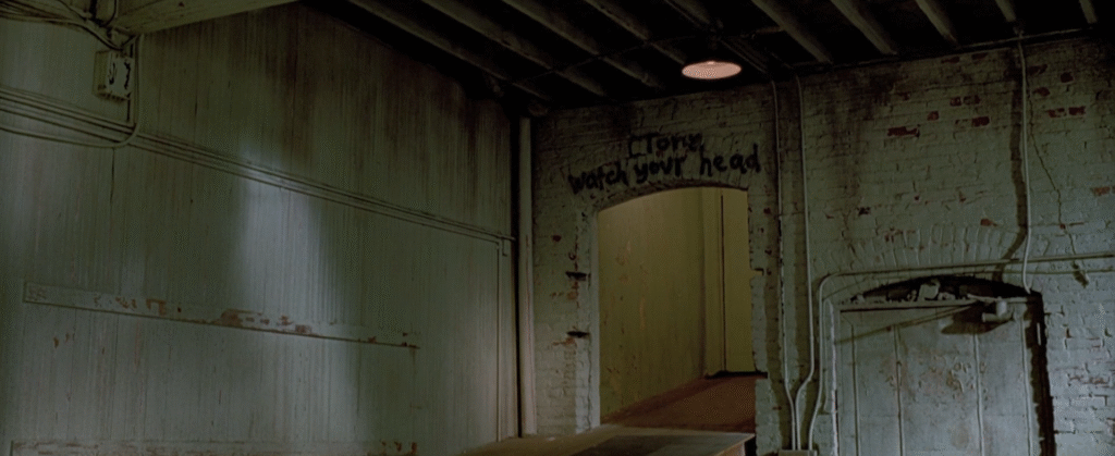 هنگامی که آقای بلوند سرگرم لذتبردن از دگرآزاریاش است، دوربین با فاصلهگرفتن از صحنۀ مورد نظر، عبارتی را روی دیوار نمایش میدهد که پیش از این نیز دیده بودیم اما اینگونه با تمرکز ویژۀ دوربین روی آن، با آن مواجه نشدیم. روی دیوار این جمله نوشته شده: watch your head، به معنی «مراقب سرت باش». این جمله که دلالت بر نوعی هشدار است، در پیوست با آن صحنه، این حس را میدهد که گویی چنین جملهای و چنین اخطاری، نوعی هشدار به مخاطب است. انگار میخواهد منتقل کند که این شخصیت دگرآزار شخصیت خطرناکی است.