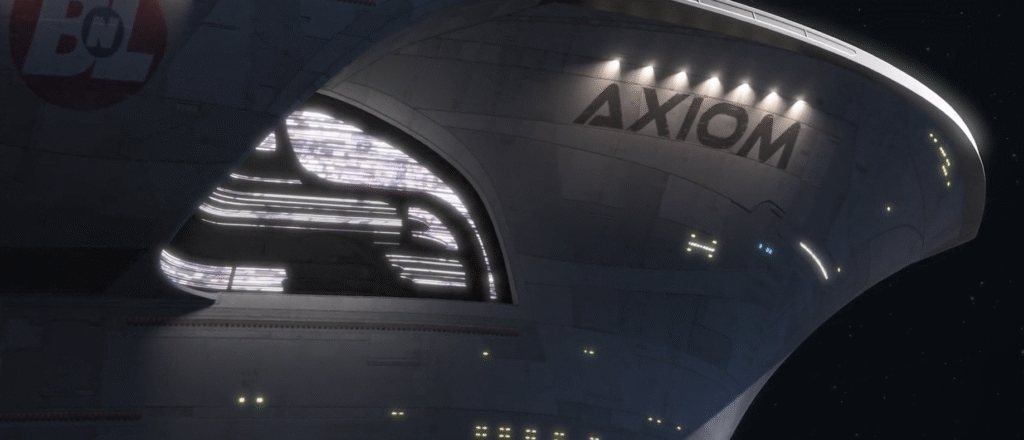 وقتی والای و ایو سیارۀ عقیم زمین را ترک میکنند، وارد جایی میشوند که «آکسیوم» نام دارد. در ابتدای فیلم میبینیم که از مکانی سخن گفته شده و انسان به جایی دعوت شده که در نسبت با سیارۀ زمین گزینۀ بسیار مطلوبتری برای سکونت به حساب میآید. در ابتدای اثر، آن سرزمین موعود اینگونه معرفی میشود: «در آکسیوم، زندگی خوب و تازهای در انتظارتونه.» سپس تصاویری نمایش داده میشود که وجه مشترک تمامشان، رضایت، آرامش و شادی انسانهاست. تفریحات متنوع جریان دارد و لبخند از لب ساکنینش محو نمیشود. اما به واسطۀ حضور پررنگ رباتها در آکسیوم، انسان زندگی متفاوتی را در مقایسه با زندگی در زمین تجربه میکند.