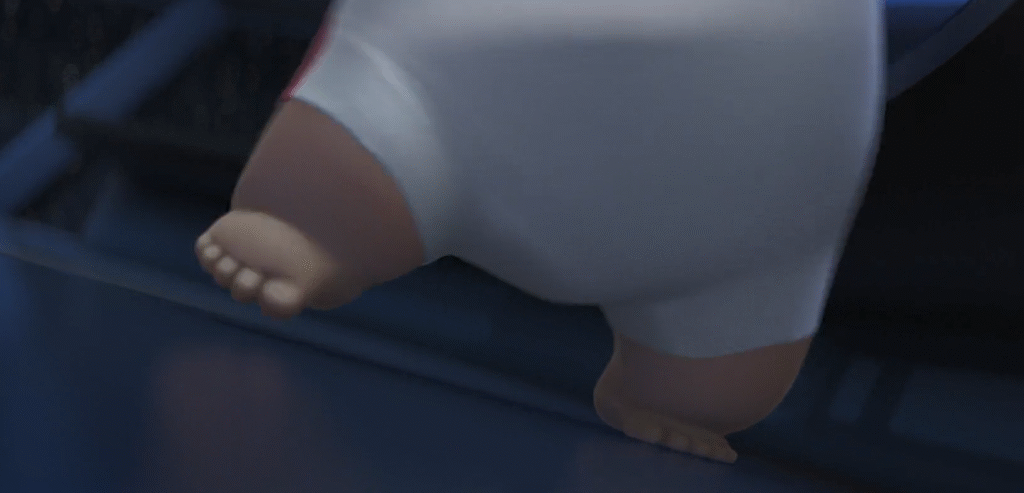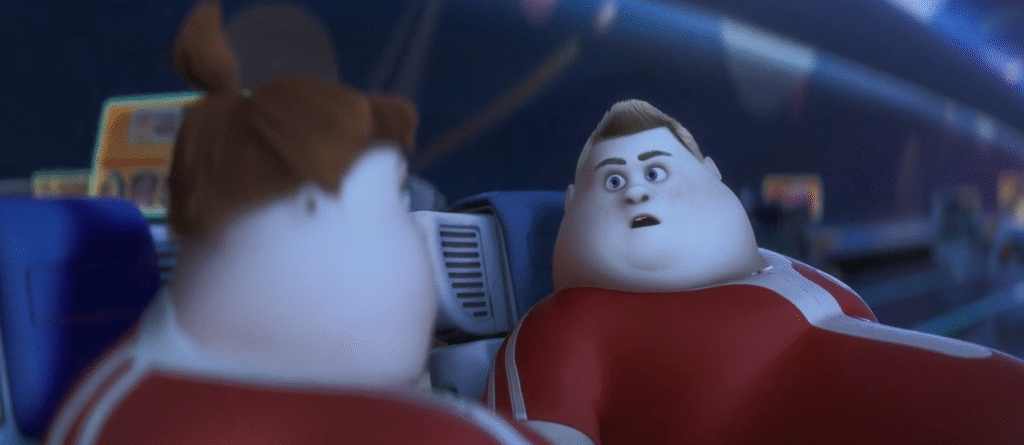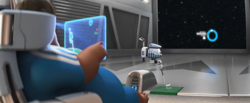 در ادامۀ داستان، وقتی اثر قصد معرفی کاپیتان را دارد، پیش از آنکه خود کاپیتان نمایش داده شود، چهرۀ افرادی که پیش از او کاپیتان بودهاند، نشان داده میشود. با کمی دقت متوجه میشویم که تصویر کاپیتان بعدی در مقایسه با کاپیتان قبلی پرتر و چاقتر است، به طوری که اولین کاپیتان لاغرتر از همه و آخرینشان چاقترین است. و این در نسبت مستقیم با نوع زندگیِ بیتحرک و منفعلانه در آکسیوم است.