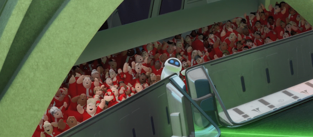 وقتی انیمیشن به لحاظ زمانی جلوتر میرود، والای و ایو در قسمتی خارج از سفینۀ آکسیوم اما نزدیک به آن، دور میزنند. همین سبب میشود که نظر دو تن از افراد داخل سفینه جلب شود. یکیشان که زن است، گویا برای اولینبار فضای خارج از سفینه را میبیند. با نگاه به این فضا، از تعداد زیاد ستارهها تعجب میکند. او در آکسیوم، تا به حال آنچنان اسیر در جهان مجازی بوده که بهکل کوچکترین توجه -و به تبع آن، آگاهی- به محیط اطرافش نداشته است. در واقع انسان حاضر در آکسیوم انسانیست که امورش تسریع و رتق و فتق شده اما این به بهای از دسترفتن آگاهی و پویایی انسان و نیز روابط عاطفی است.