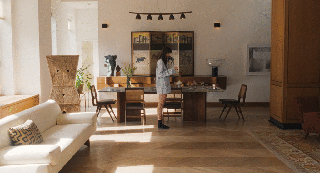 در واقع اهمیت دیالوگها و صحنه در دوربین هم دیده میشود. در این میان، فیلم بهخوبی لحظات کمدی خود را کنترل میکند. در برابر صحنهای با لحنی جدی، سکانس خانهی مجلل هری قرار دارد که بغایت طنزآمیز و در تضاد با فضای پیشین است؛ جایی که لوسی، بهجای لذت از معاشقه، در شکوه و جاذبهی خانه غرق میشود. صبح روز بعد نیز، هنگامی که هری او را با میز صبحانه تنها میگذارد، دوربین در نمایی باز، سادگی حضور او را در برابر نظم بصری و جلوهی خانه به تصویر میکشد (تصویر 6).